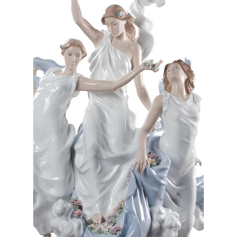 - Glossy porcelain sculpture of three women suspended on spongy clouds with long white dresses decorated with handmade flowers