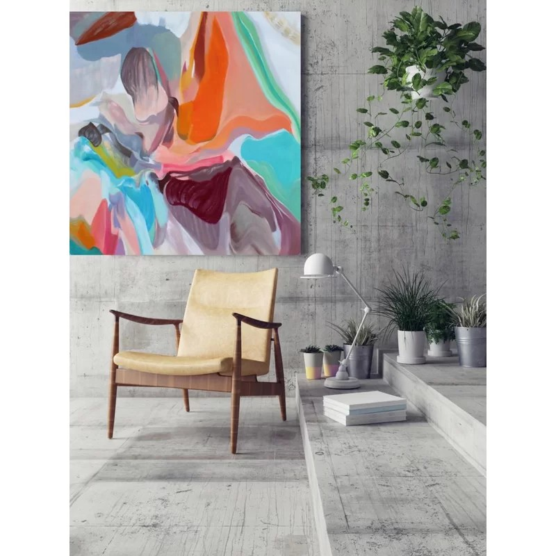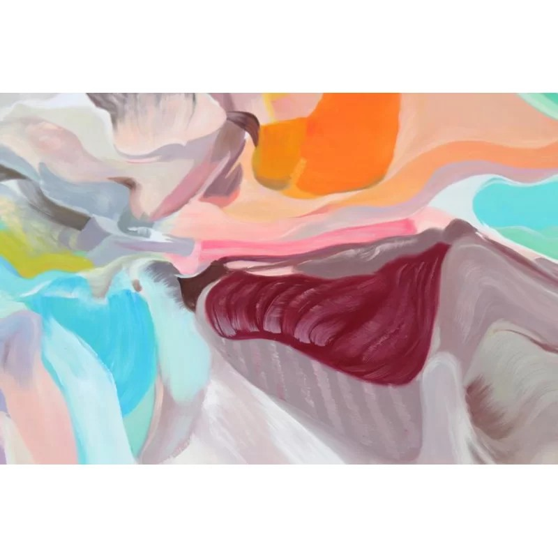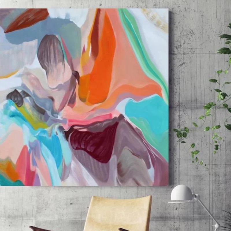 Abstract colorful oil painting, orange brown aqua on stretched canvas.