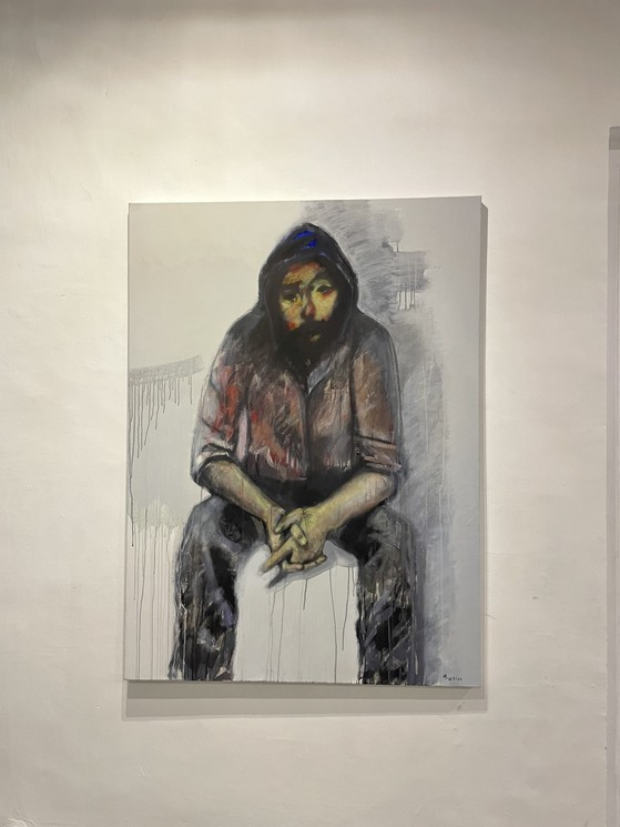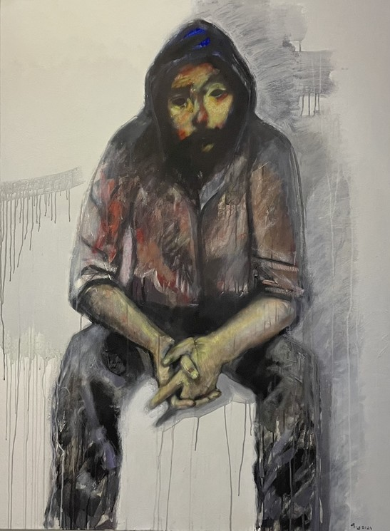 This compelling artwork presents a deeply evocative portrait of a solitary figure, exuding an air of introspection and solemnity. The subject, with a hooded jacket, sits on an indistinct surface, hands clasped in a poignant gesture at the forefront of the composition. The artist employs a muted palette, dominated by shades of gray, brown, and subtle hints of color, enhancing the somber mood of the piece. Noteworthy is the textured brushwork, which is expressive and layered, contributing to the raw, almost gritty realism of the painting. The application of paint appears almost dripping in places, suggesting a sense of decay or transience, as if the figure is gradually dissolving into the background. This technique adds a sense of motion and temporal fragility, rendering the figure both present and ephemeral. The background is minimalist, allowing the figure to dominate the visual field. The blurred edges and abstract nature of the backdrop contrast sharply with the more defined form of the subject, creating a haunting, dream-like atmosphere. The use of light and shadow is meticulously crafted, highlighting the contours of the face and the folds of the clothing, lending depth and three-dimensionality to the work. This piece stands out for its emotional intensity and technical prowess. It captures a moment of stillness, imbued with a profound existential weight, making it a thought-provoking and memorable work of art.