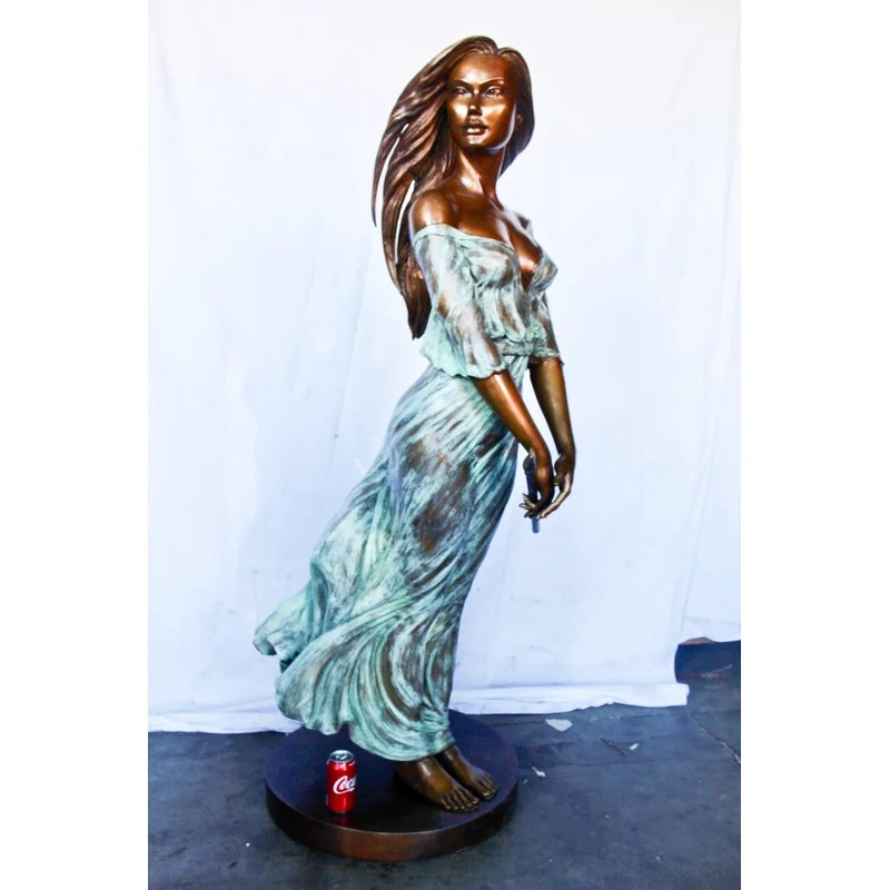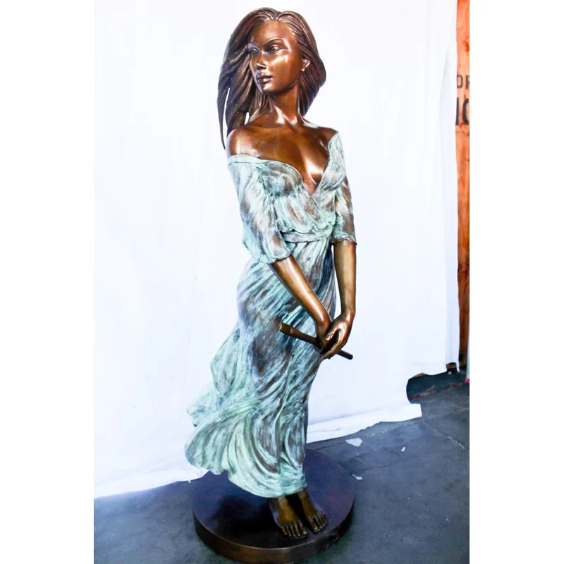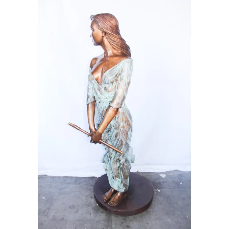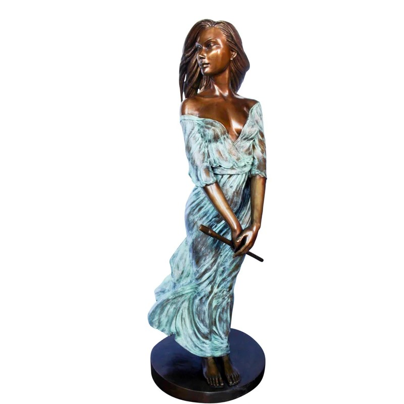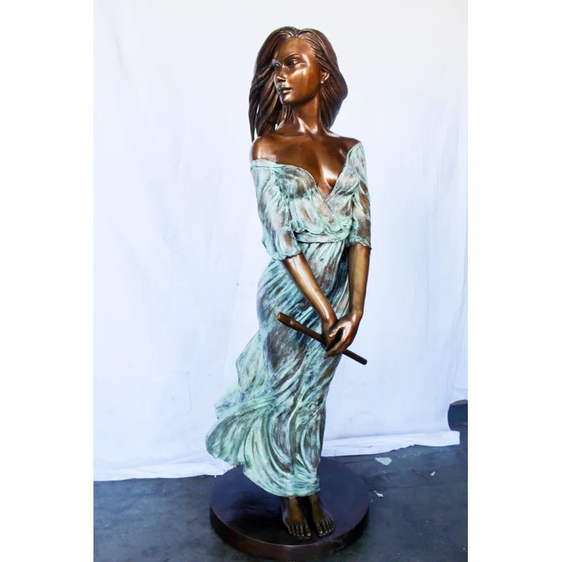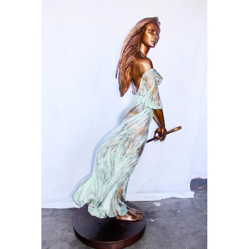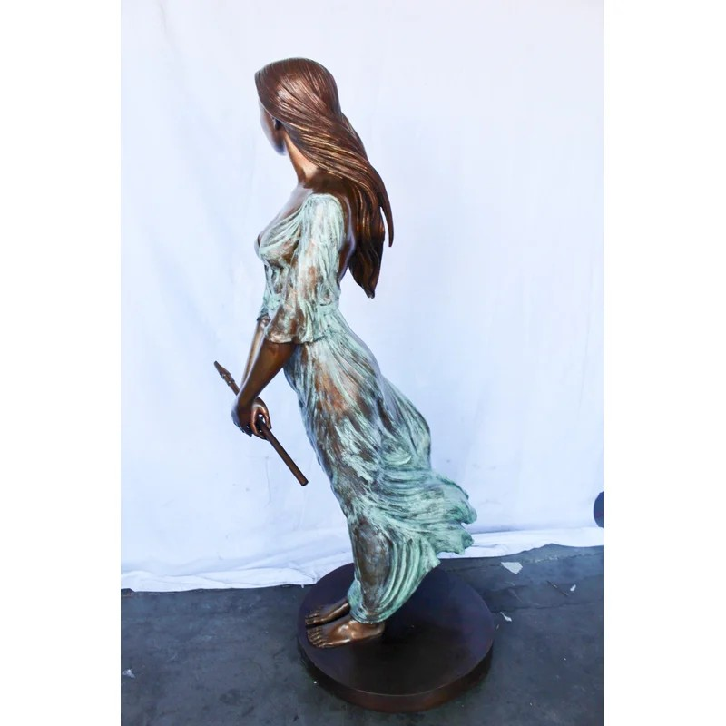 This breathtaking bronze statue is one of our most exquisite pieces. With a dress comprised of green patina, it creates the illusion of a thin sheer dress. The beautiful woman sways peacefully in the wind while holding her flute, signifying the talent and beauty of the individual. Her hair and dress flow with the wind. This statue would look gorgeous in any large space and will most definitely capture the entire room. Size: 34″L x 25″W x 68″H. Weight is: 142Lb