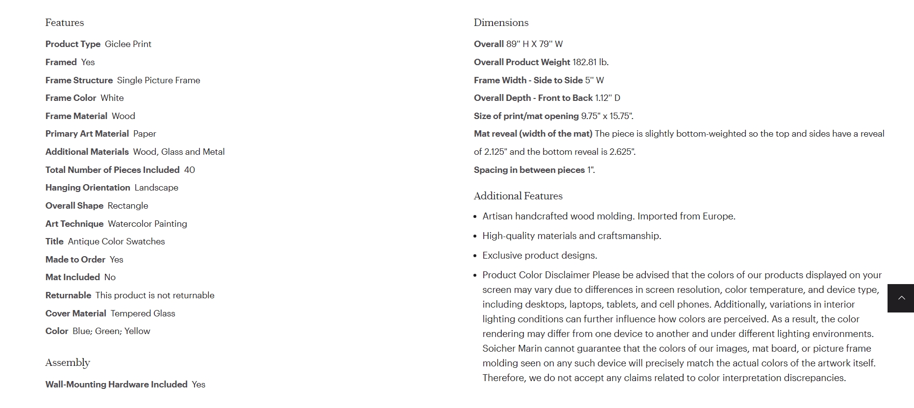 - Product Color Disclaimer Please be advised that the colors of our products displayed on your screen may vary due to differences in screen resolution, color temperature, and device type, including desktops, laptops, tablets, and cell phones. Additionally, variations in interior lighting conditions can further influence how colors are perceived. As a result, the color rendering may differ from one device to another and under different lighting environments. Soicher Marin cannot guarantee that the colors of our images, mat board, or picture frame molding seen on any such device will precisely match the actual colors of the artwork itself. Therefore, we do not accept any claims related to color interpretation discrepancies.