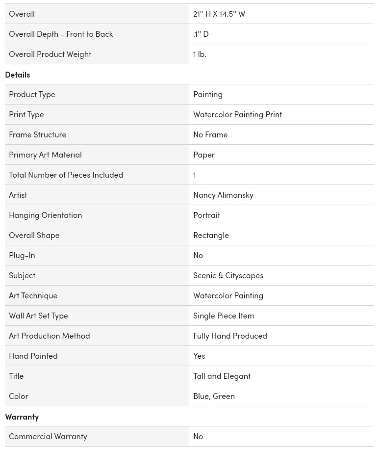 This “Tall and Elegant” unframed original watercolor painting by Nancy Alimansky is the perfect piece for your art collection. Artwork comes unframed so you can match it with your art collection.