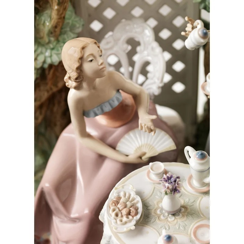 - The sculpture of women drinking tea, decorated with handmade gloss finish porcelain flowers