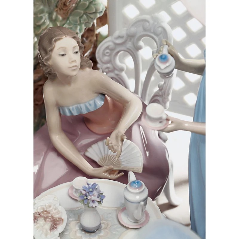 Lladró figurines often reference a timeless romanticism, an undefined but still extremely familiar world in space and time. Here, we find all that is good, noble, and beautiful in life. Such is the case with ´The Tea´, which presents us with a peaceful, evocative scene. The key to the realism and beauty of this work is its mise-en-scene, in which the delicate figures of the protagonists and precise decoration of their surroundings take on significance. This High Porcelain limited edition captures the refinement of an entire era, in a bucolic scene reflecting the leisurely cadence of a unique moment. Special mention should be given to the roughly 300 flowers, some of which form a complex bower and which posed a technical challenge to Lladró experts, particularly in firing. The fans and dresses of the three ladies are enhanced with embroidery and hand-painted prints and lace. More than 70 colors have been used for the decoration of a piece full of minute details which turn the entire piece into a masterpiece.