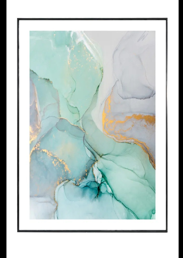 The Aqua Vermeil painting is the ideal way to add color to your walls, combining light shades of blue, green, and gray with touches of gold for an elegant finishing touch. This is an abstract piece that will lift and brighten your space, but the tasteful teal tones will enhance it perfectly. Fashionable and printed on acid-free paper, this is a must-have item to enhance your walls and add a creative touch. Placed inside a black wooden frame that is prepared for straight mounting to a wall.