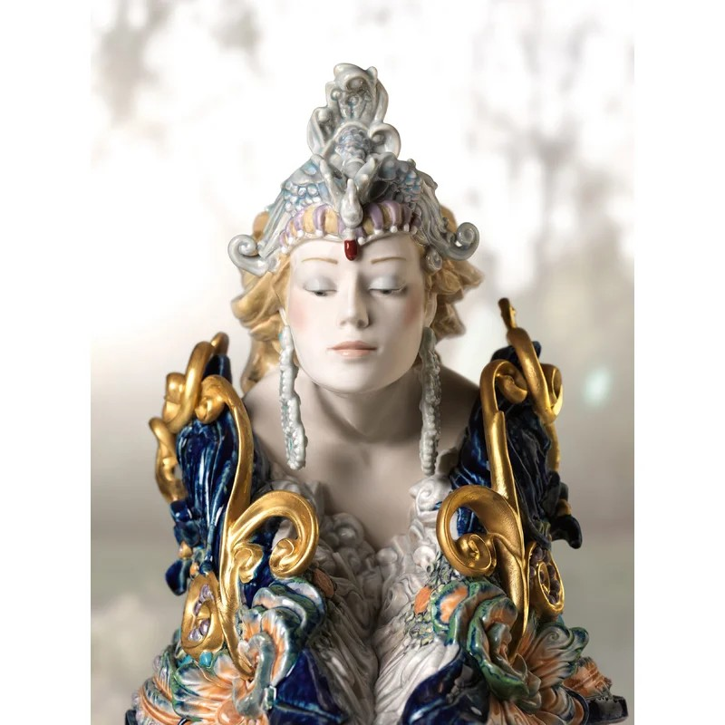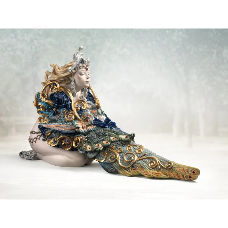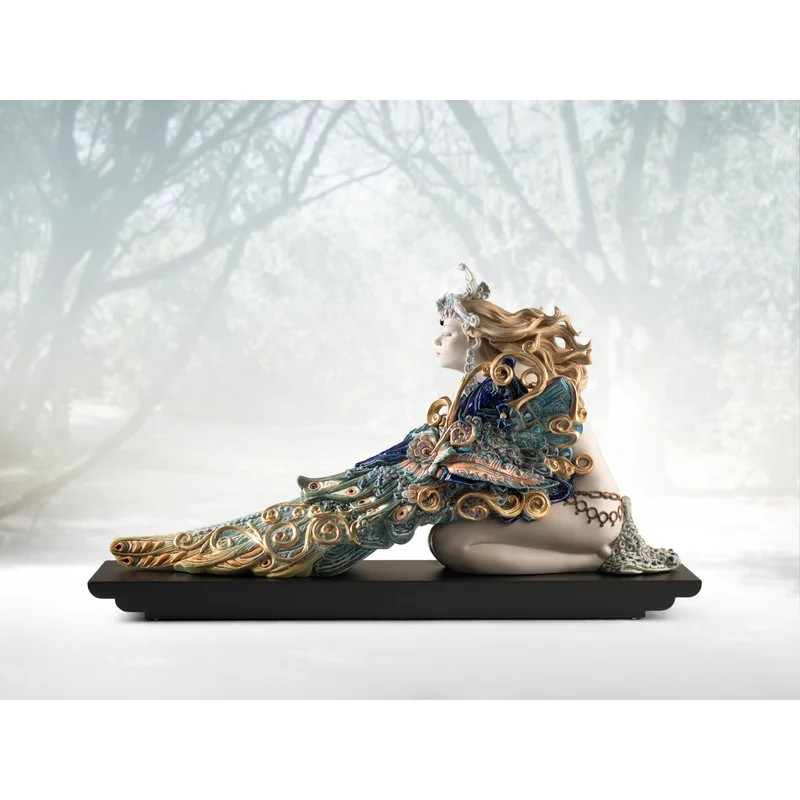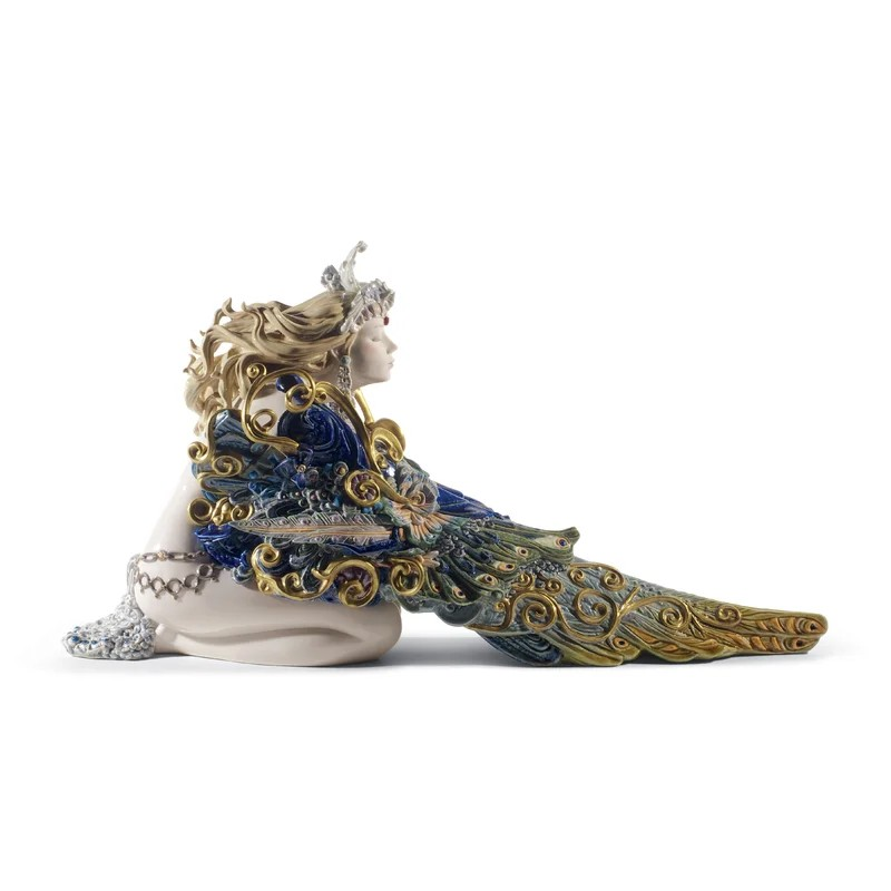 Half woman, half goddess, the protagonist of this piece, inspired by ancient mythology, offers us a beautiful and powerful representation of femininity. With a blend of sensuality and mystical force, this High Porcelain limited edition refers us to that space reserved in the past for magic and freedom, the feminine principles of the exaltation of life, of which the art of ancient civilizations has left us a testimony. The colour and decoration of the piece are inspired by the majestic plumage of the peacock, with the implementation of various techniques from enamels in varying shades of green, blue and ochre, to the use of coloured glazes and metallic lustre. The complex, brilliant interplay of tones and the colour palette is heightened with an aged golden lustre, which reinforces the sense of nobility and solemnity inspired by the figure.